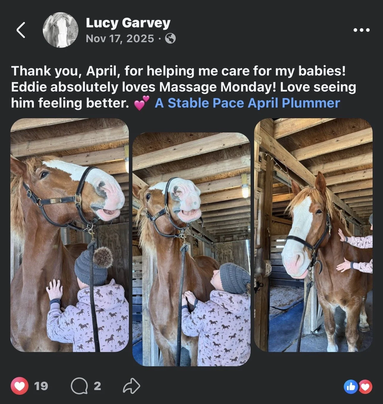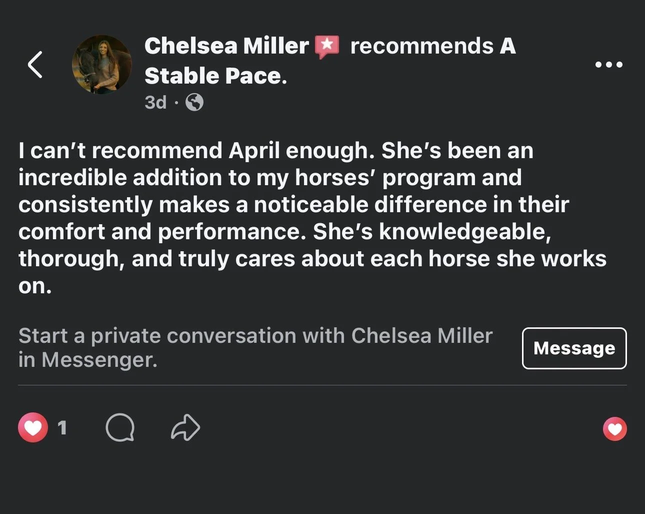 “April Plummer at A Stable Place is truly exceptional. Having had the unique opportunity to work alongside her in the past, I’ve not only seen her equine massage sessions but also had the privilege of learning from her firsthand. From the technique she has showed me to the products she recommends, I definitely see a difference in the personal horse I currently have as well as lesson horses! April’s techniques are highly effective, and her commitment to continuing education speaks volumes about her dedication. Every horse I’ve seen her work on has been visibly more relaxed and enjoyed the session. Horses are fantastic judges of character and they clearly love April! She has also been incredibly supportive and generous with her knowledge, always willing to encourage and guide those eager to learn more. She truly is fantastic roll model to me!”